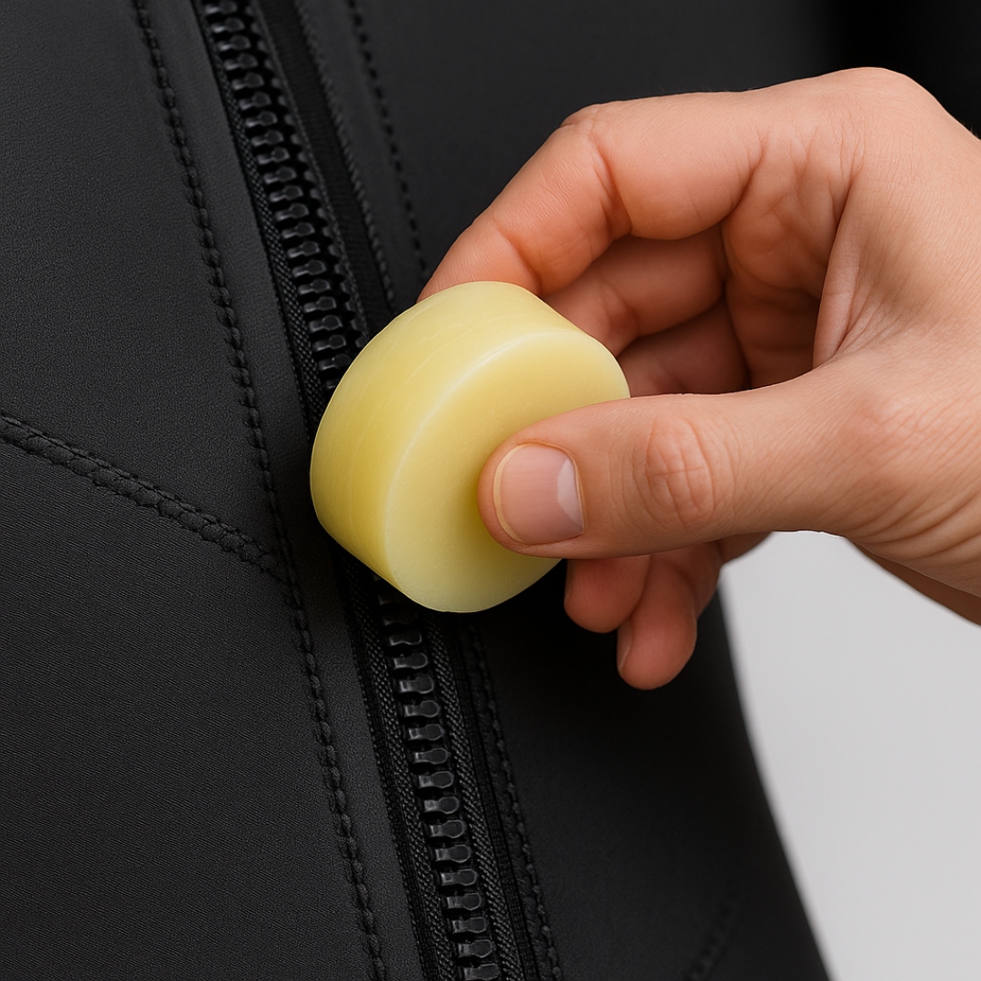 Rub the wax directly onto the zip teeth and runners. Work the zip back and forth to distribute evenly. Reapply after rinsing or before storage for best results.